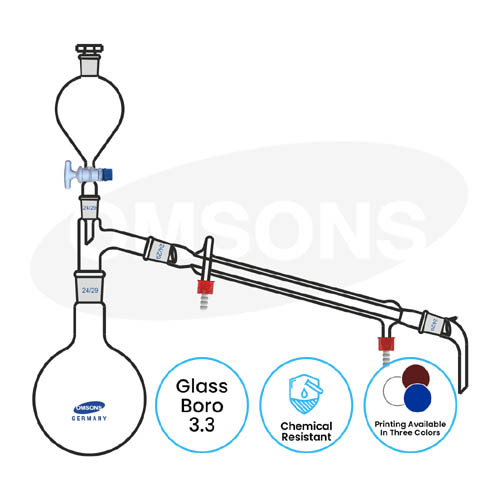 | 395/1 | Distillation Apparatus consists of R.B. Flask 500 ml., still head, Liebig condenser 400 mm., Receiver adapter, separating funnel 100 ml. and stopper. | 1 |